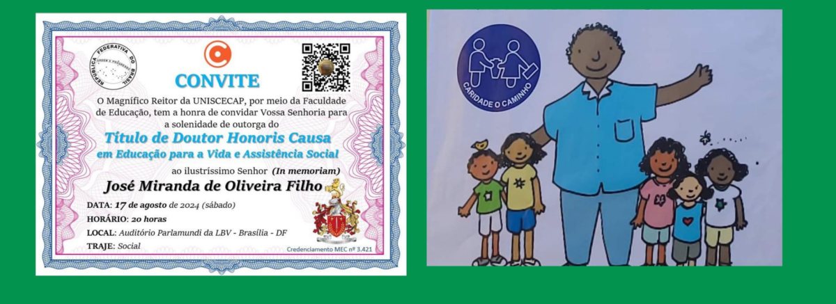 José Miranda de Oliveira Filho recebeu o título DOUTOR HONORIS CAUSA in memorian em reconhecimento ao seu trabalho intenso nacional e internacional na EDUCAÇÃO PARA A VIDA E ASSISTÊNCIA SOCIAL. O título é concedido pela Academia Brasileira de Ciências, Artes, História e Literatura @abrascioficial indicado pelos imortais da academia científica em reconhecimento a pessoas que fizeram a diferença na vida das pessoas …